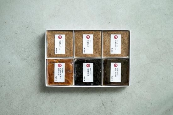 山椒じゃこ50g×3、茎わかめ煮70g、山椒昆布70g、大根と生姜の煮切り漬100g